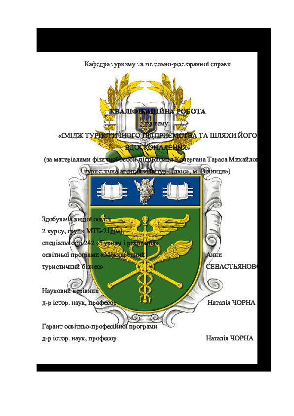 | Title: | Імідж туристичного підприємства та шляхи його вдосконалення (за матеріалами фізичної особи-підприємця Кочергана Тараса Михайловича, туристична агенція «Вінтур-Плюс», м. Вінниця») |