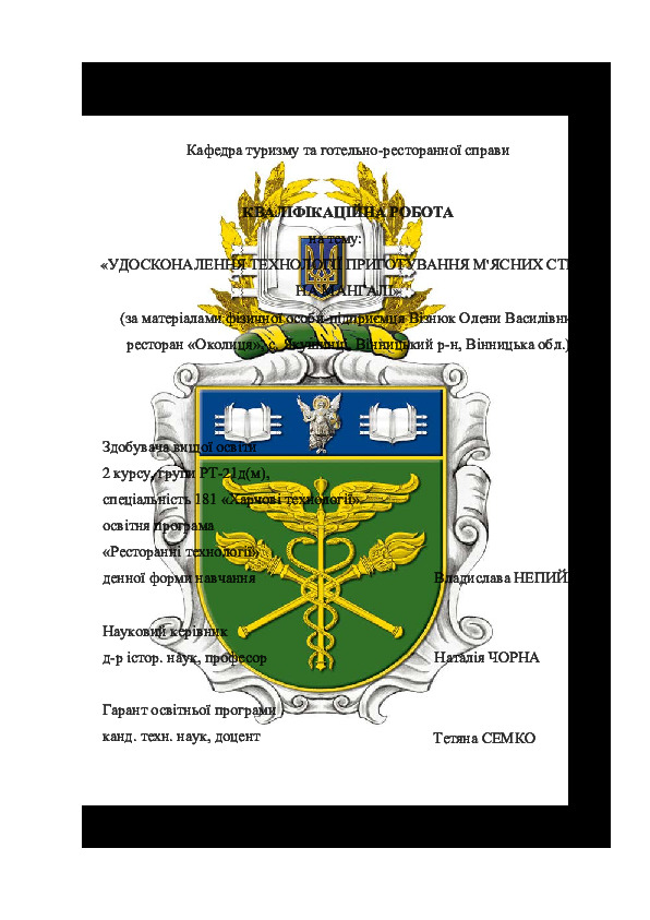 | Title: | Удосконалення технології приготування м`ясних страв на мангалі (за матеріалами фізичної особи-підприємця Візнюк Олени Василівни, ресторан «Околиця», с. Якушинці, Вінницький р-н, Вінницька обл.) |