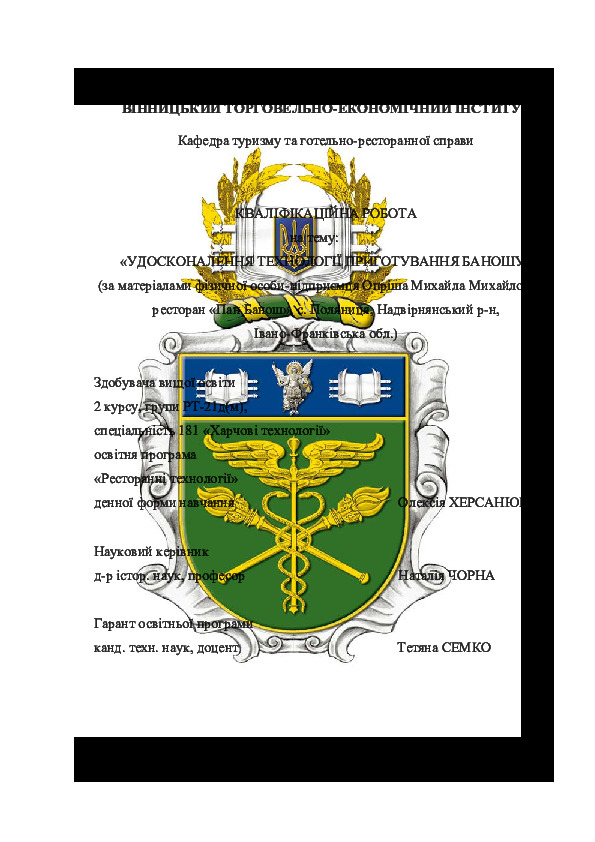 | Title: | Удосконалення технології приготування баношу (за матеріалами фізичної особи-підприємця Опріша Михайла Михайловича, ресторан «Пан Банош», с. Поляниця, Надвірнянський р-н, Івано-Франківська обл.) |