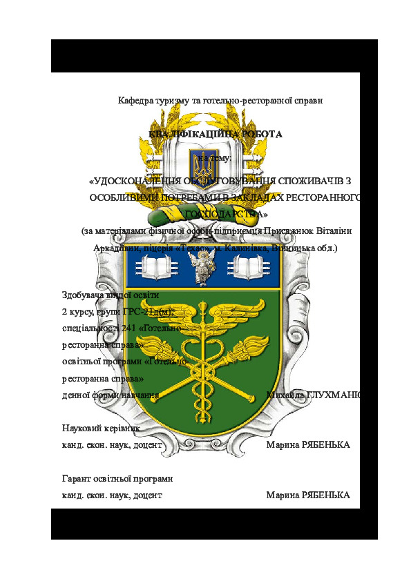 | Title: | Удосконалення обслуговування споживачів з особливими потребами в закладах ресторанного господарства (за матеріалами фізичної особи-підприємця Присяжнюк Віталіни Аркадіївни, піцерія «Техас», м. Калинівка, Вінницька обл.) |