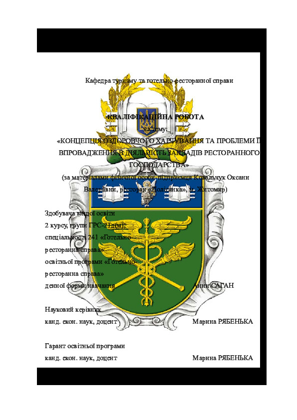 | Title: | Концепція оздоровчого харчування та проблеми її впровадження в діяльність закладів ресторанного господарства (за матеріалами фізичної особи-підприємця Ковальчук Оксани Валеріївни, ресторан «Полісянка», м. Житомир) |