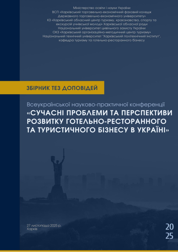 | Publication: | Сучасні проблеми та перспективи розвитку готельно-ресторанного та туристичного бізнесу в Україні: збірник матеріалів II Всеукраїнської науково-практичної конференції (27 листоп. 2025 р., м. Харків). Харків : ВСП «Харківський торговельно-економічний фаховий коледж ДТЕУ», 2025. С. 101-102 |