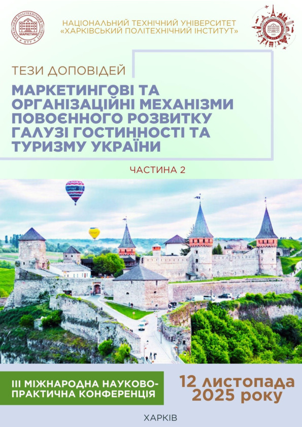 | Publication: | Маркетингові та організаційні механізми повоєнного розвитку галузі гостинності та туризму України : тези доповідей III Міжнародної наук.-практ. конф., 12 листопада 2025 року, м. Харків. Частина 2. Національний технічний університет «Харківський політехнічний інститут». Харків, 2025. С. 271-274 |