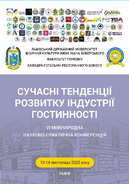 | Publication: | Сучасні тенденції розвитку індустрії гостинності : зб. тез доп. VI Міжнар. наук.-практ. конф. (13–14 листопада 2025 року, м. Львів). Львів: ЛДУФК ім. Івана Боберського, 2025. |