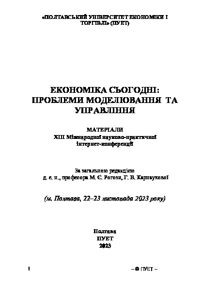 | Publication: | ХІІІ Міжнародної науково-практичної інтернет-конференції. За загальною редакцією д. е. н., професора М. Є. Рогози, Г. В. Карнаухової (м. Полтава, 22–23 листопада 2023 року). Полтава: ПУЕТ. С .207-212. URL : http://www.ek.puet.edu.ua/files/conf2023.pdf |