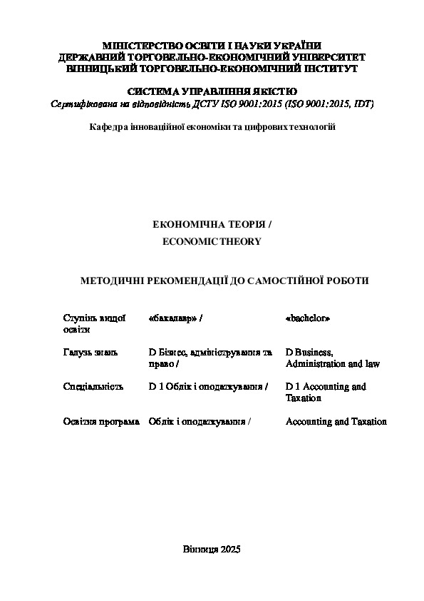 | Summary: | Економічна теорія є фундаментальним освітнім компонентом, виступає основою, на якій базується вивчення економічних освітніх компонент. «Економічна теорія» досліджує проблеми політекономії, у тому числі: економічні системи, відносини власності, теорії грошей; проблеми мікроекономіки, у тому числі: теоретичні аспекти ринкової економіки та ринкового механізму, проблеми доходів і заробітної плати, поведінку споживача, ефективність господарювання підприємств (фірм) в ринкових умовах. В освітньому компоненті «Економічна теорія» досліджуються проблеми макроекономіки, а саме: суспільне відтворення, економічне зростання, інфляція, безробіття та державне регулювання в умовах ринкової економіки. Розглядаються проблеми мезорівня - особливості дії економічних законів в аграрному секторі. Вивчаються проблеми мегарівня -закономірності розвитку світового господарства. Освітній компонент «Економічна теорія» містить концептуальні положення теоретичної економіки, які допоможуть здобувачам освітнього ступеня бакалавр освітньої програми «Облік і оподаткування» з’ясувати суть і специфіку основних механізмів ринкової економіки, факторів, що впливають на мікро- та макро- процеси, методи та засоби економічного регулювання. |