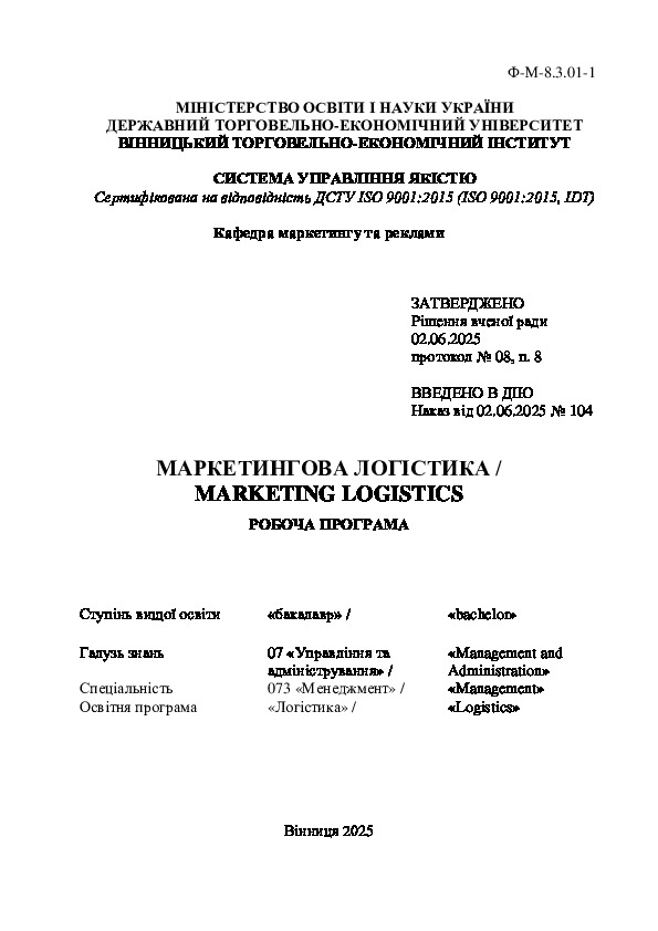 | Publication: | : робоча програма. Вінниця : Редакційно-видавничий відділ ВТЕІ ДТЕУ, 2025. 22 с. |