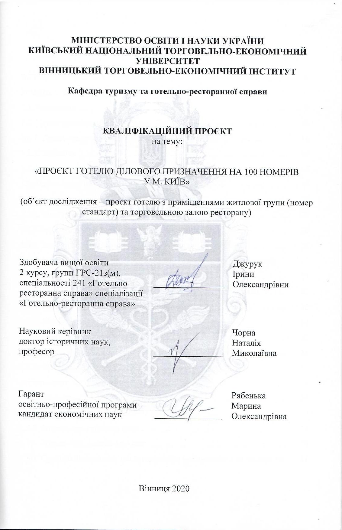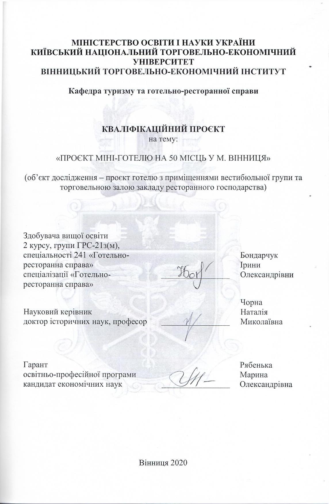 Проєкт міні-готелю на 50 місць у м. Вінниця (об'єкт дослідження - проєкт готелю з приміщеннями вестибюльної групи та торговельною залою закладу ресторанного господарства)
