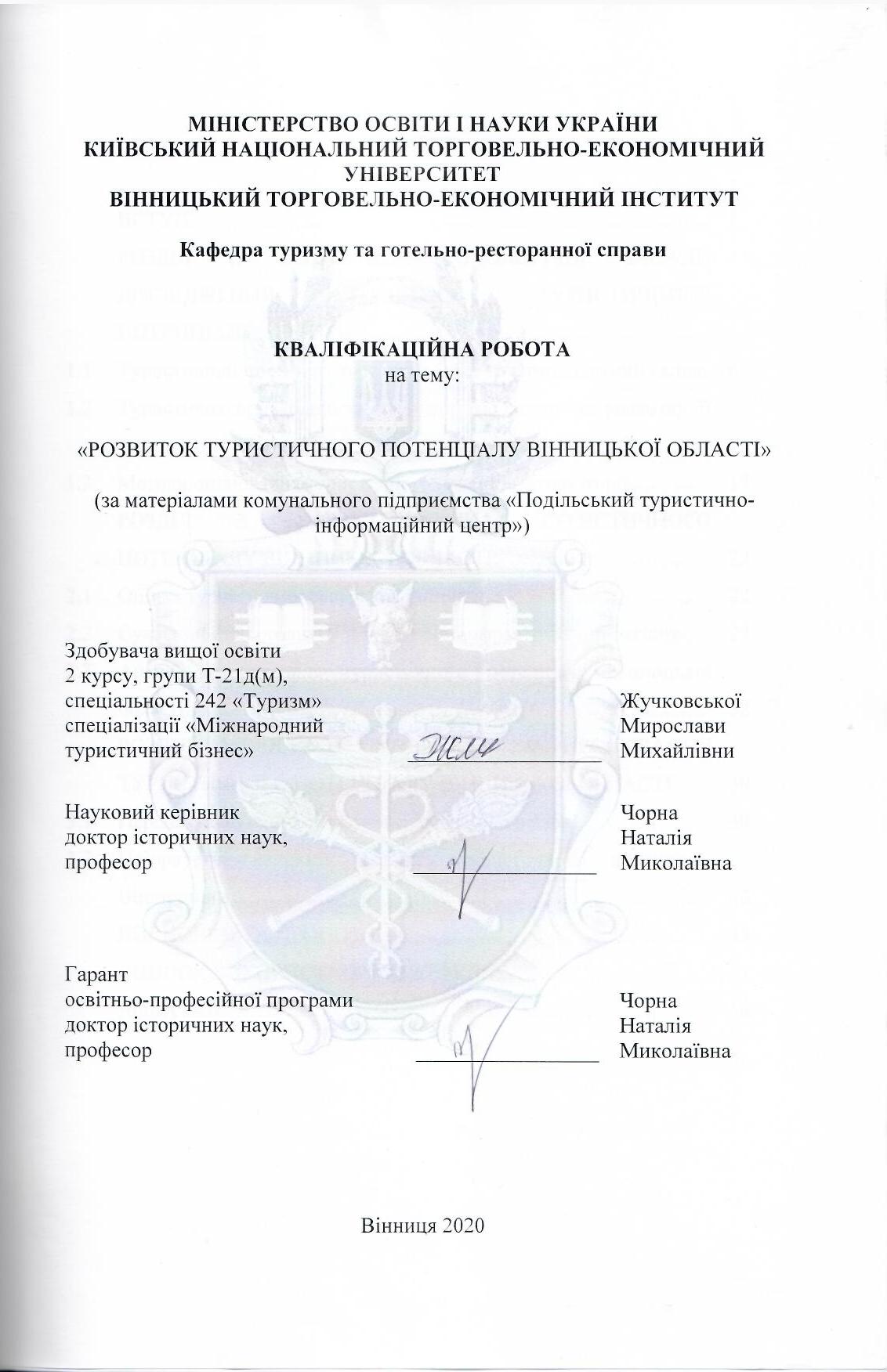 Розвиток туристичного потенціалу Вінницької області (за матеріалами комунального підприємства "Подільський туристично-інформаційний центр")