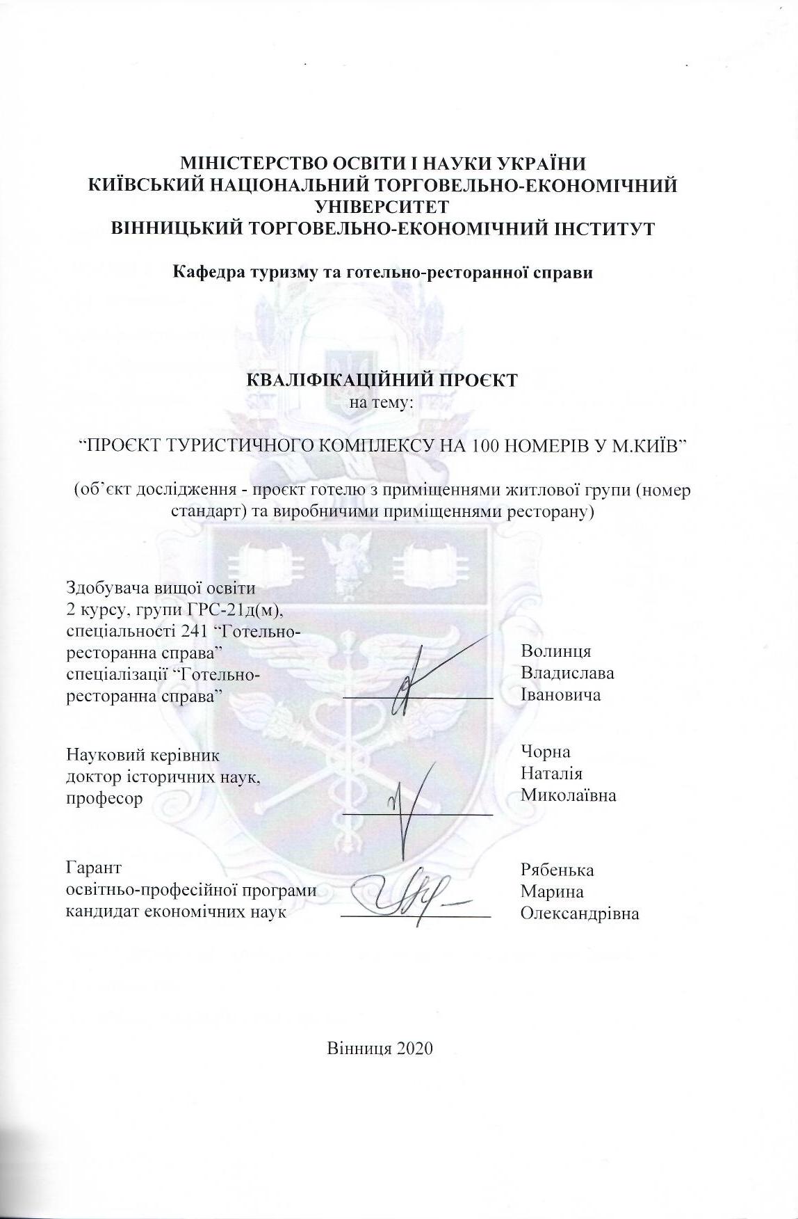 Проєкт туристичного комплексу на 100 номерів у м. Київ (об'єкт дослідження - проєкт готелю з приміщеннями житлової групи (номер стандарт) та виробничими приміщеннями ресторану)