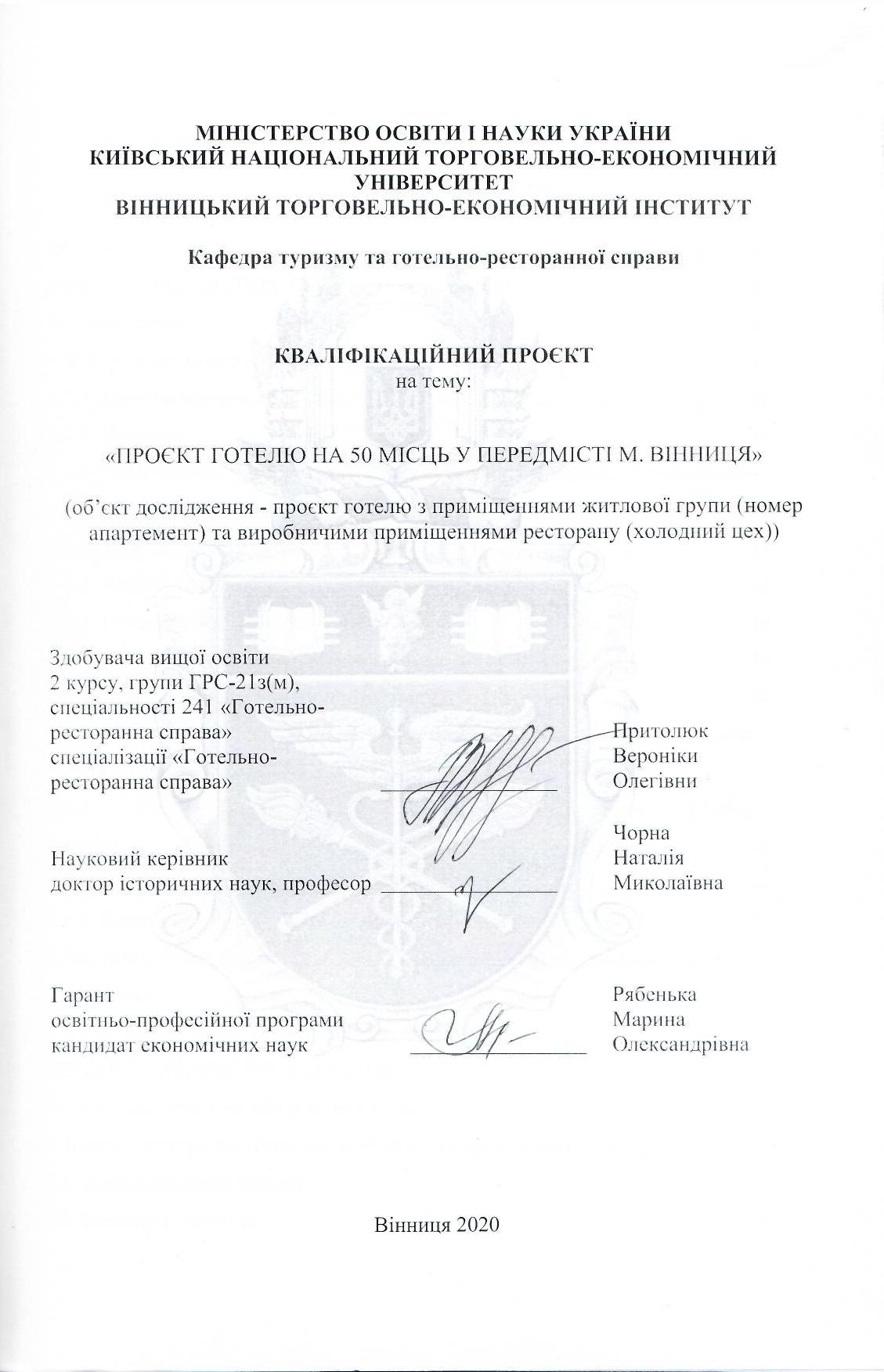 Проєкт готелю на 50 місць у передмісті м. Вінниця (об'єкт дослідження - проєкт готелю з приміщеннями житлової групи (номер апартамент) та виробничими приміщеннями ресторану (холодний цех))