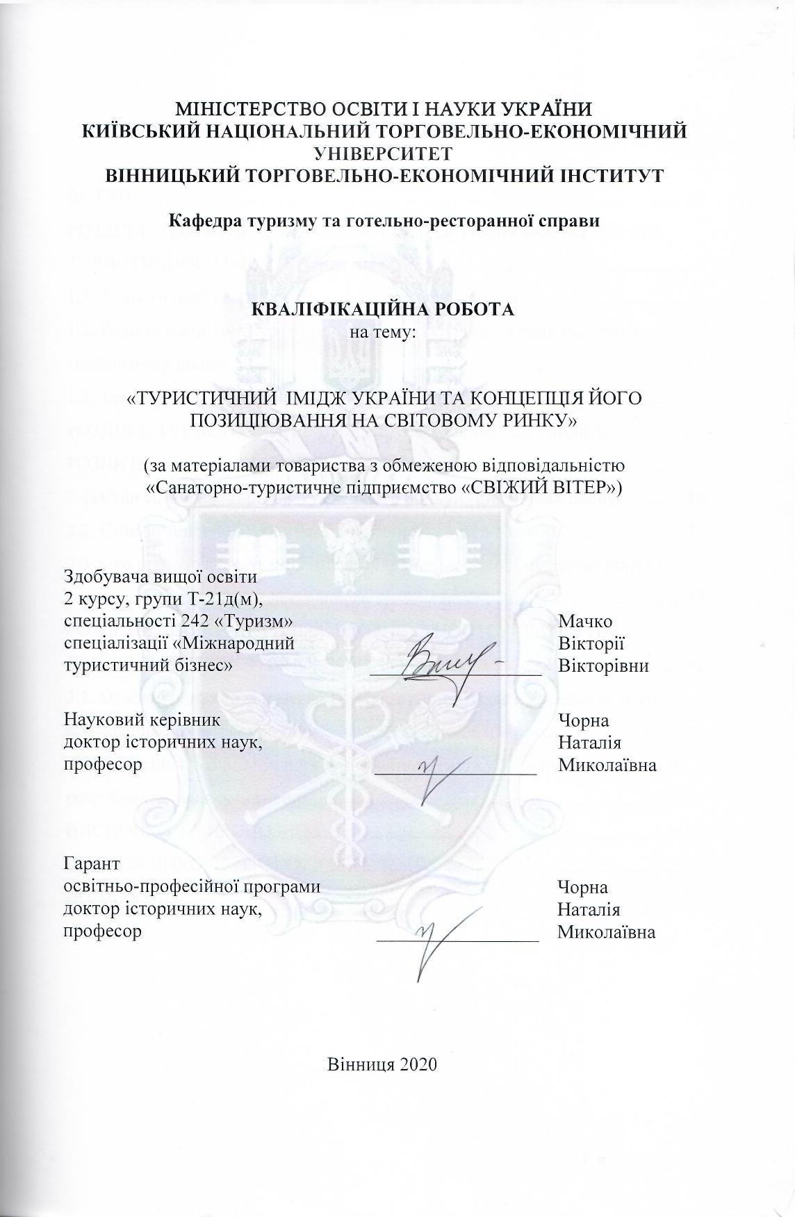 Туристичний імідж України та концепція його позиціювання на світовому ринку (за матеріалами товариства з обмеженою відповідальністю "Санаторно-туристичне підприємство "Свіжий вітер"")