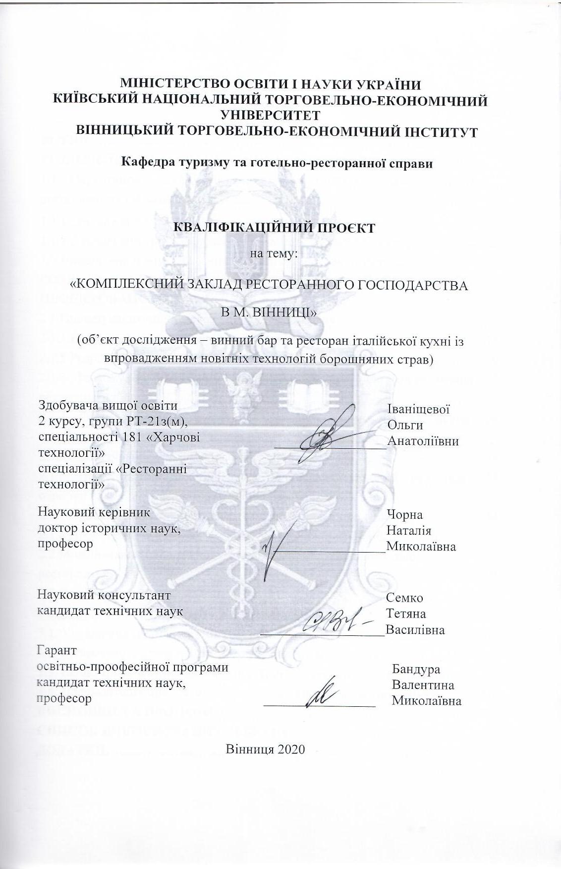 Комплексний заклад ресторанного господарства в м. Вінниці (об'єкт дослідження - винний бар та ресторан італійської кухні із впровадженням новітніх технологій борошняних страв)